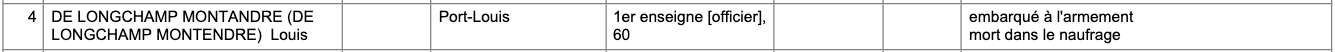 Sa présence à bord du narvire est attestée dans le rôle d’équipage, tout comme celle de son fiancé, Louis de MONTENDRE de LONGCHAMPS.